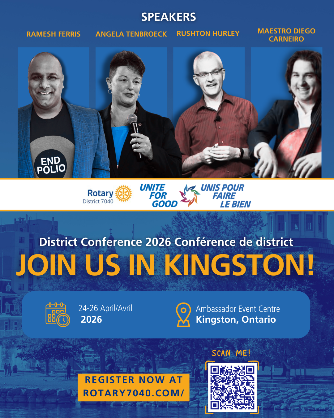 Mark your calendars to travel to Kingston on April 25, 2026, for a full day of Rotary fellowship, learning and fun at The Ambassador Conference Centre at the Hilton DoubleTree and Home2Suites (formerly known as The Ambassador Hotel). For those who are staying a night or two, the weekend will include optional and social events on Friday, an off-site welcome reception. On Sunday, try a Friendly Pickleball game (for the Foundation).