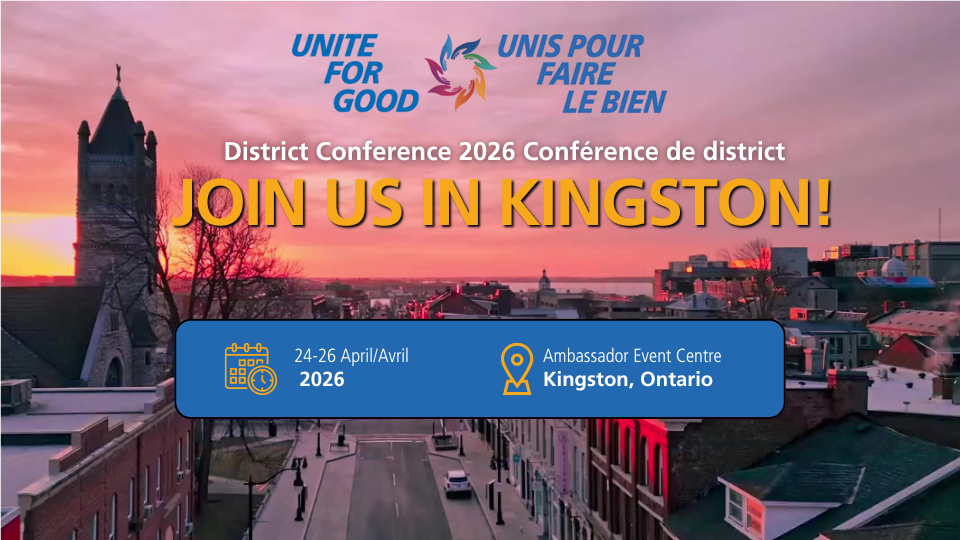 Mark your calendars to travel to Kingston on April 25, 2026, for a full day of Rotary fellowship, learning and fun at The Ambassador Conference Centre at the Hilton DoubleTree and Home2Suites (formerly known as The Ambassador Hotel). For those who are staying a night or two, the weekend will include optional and social events on Friday, an off-site welcome reception. On Sunday, try a Friendly Pickleball game (for the Foundation).